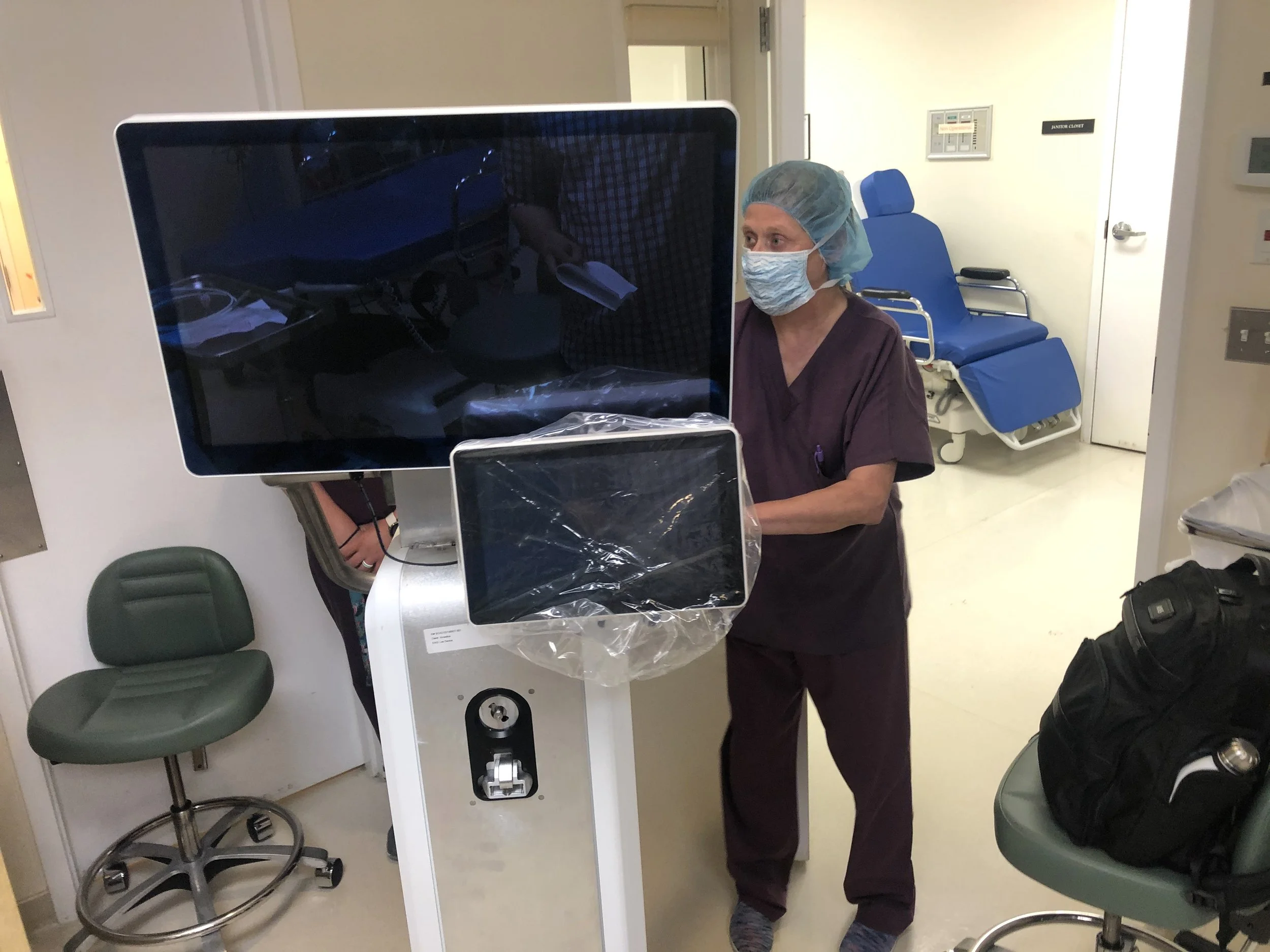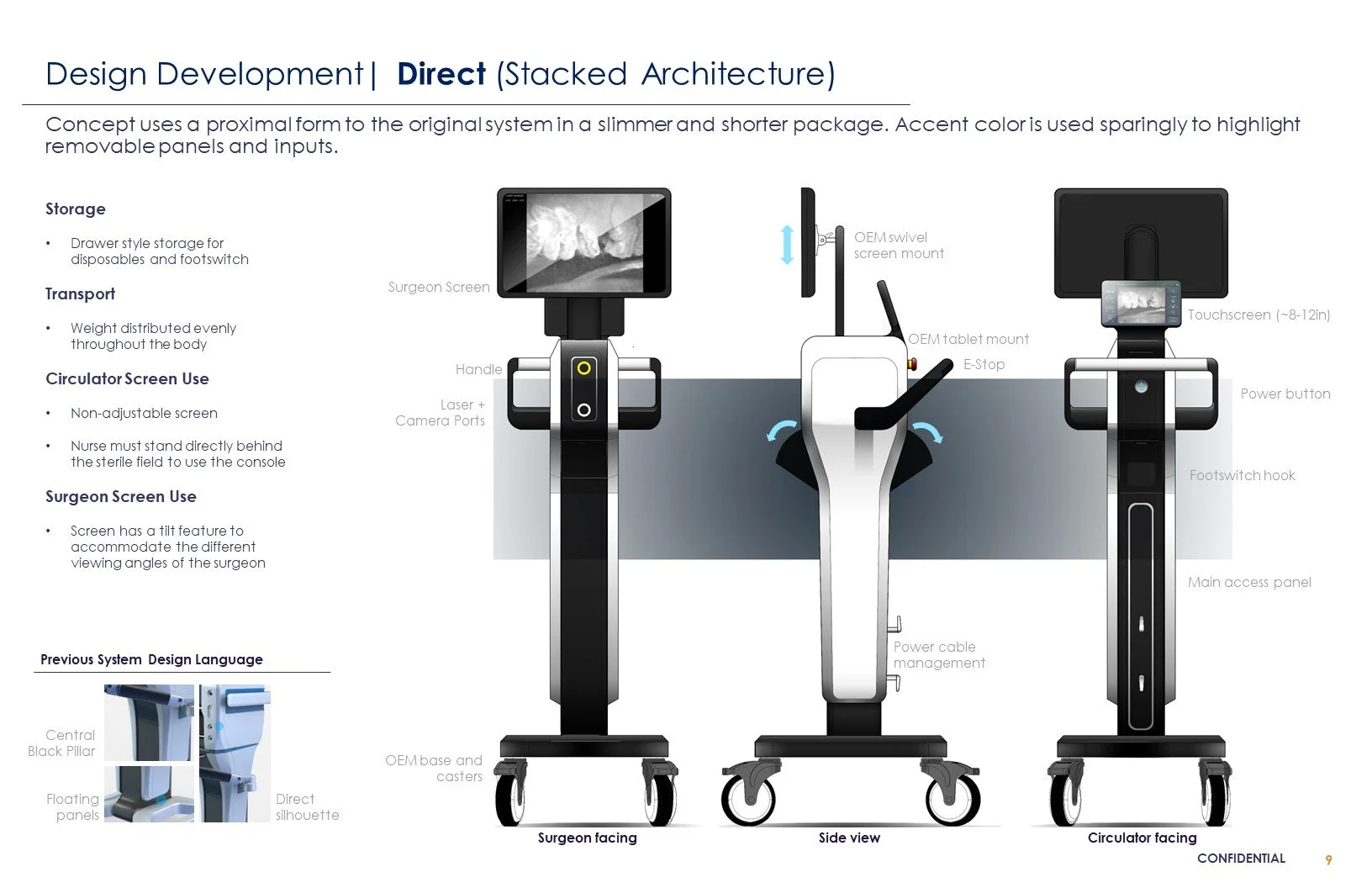 All-in-one console with a dual screen for Surgeon (driver) and co-pilot (nurse)